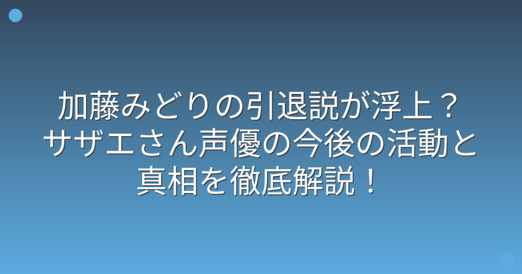 声優界の大御所として知られる加藤みどりさんの引退説が、ネット上で話題になっています。 『サザエさん』のサザエ役として長年活躍してきた加藤みどりさんですが、最近になって引退の可能性について様々な憶測が飛び交っているようです。 そこで今回は、... -