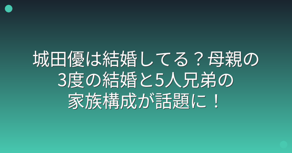 俳優として活躍する城田優さんの家族構成が大きな話題になっていますね。 特に2025年10月下旬に放送されたABEMAの番組で、城田優さんの母・ペピーさんの波乱万丈な人生が紹介され、多くの視聴者から注目を集めています。 そこで今回は、城田優さんの結婚状... -