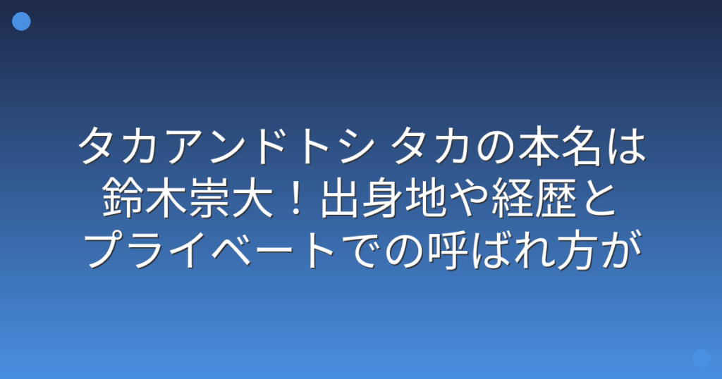 お笑いコンビ「タカアンドトシ」として長年活躍されているタカさんですが、本名が気になっている方も多いのではないでしょうか。 「欧米か!」のツッコミで知られるタカさんですが、プライベートでは本名で呼ばれているという話もあり、注目を集めています... -