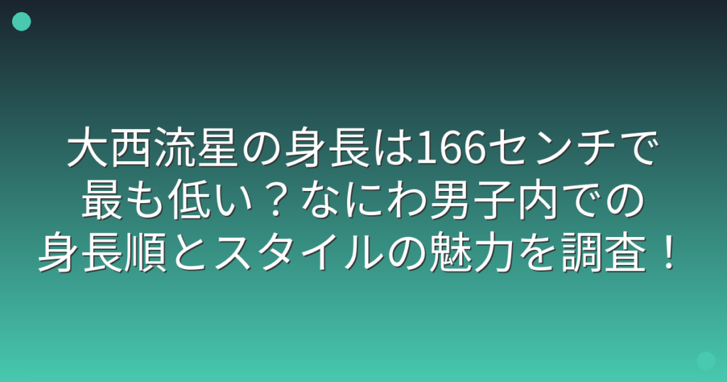 なにわ男子のメンバーとして活躍中の大西流星さんですが、その身長について気になっている方も多いのではないでしょうか。 グループ内での身長比較や、小柄ながらもステージでの存在感が話題になっていますね。 そこで今回は、大西流星さんの身長やなにわ... -