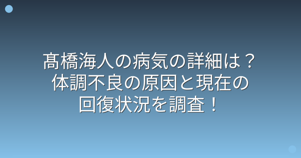 King & Princeのメンバーである髙橋海人さんが体調不良で活動を休止したことが話題になっていますね。 2025年8月下旬から体調不良に見舞われた髙橋海人さんですが、具体的な病名や症状について気になっている方も多いのではないでしょうか。 そこで今回は... -