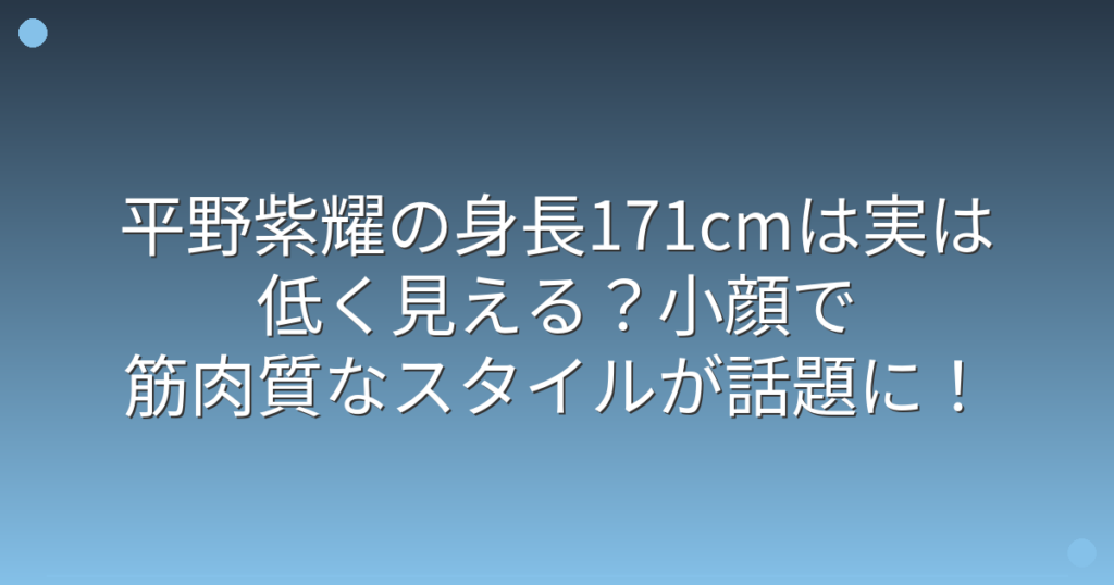 平野紫耀さんのスタイルの良さが話題になっていますね。 特に身長については、ファンの間でも様々な憶測が飛び交っています。 そこで今回は、平野紫耀さんの身長や体型について、最新情報とともに詳しく見ていきましょう! 平野紫耀の実際の身長は171cm! ... -