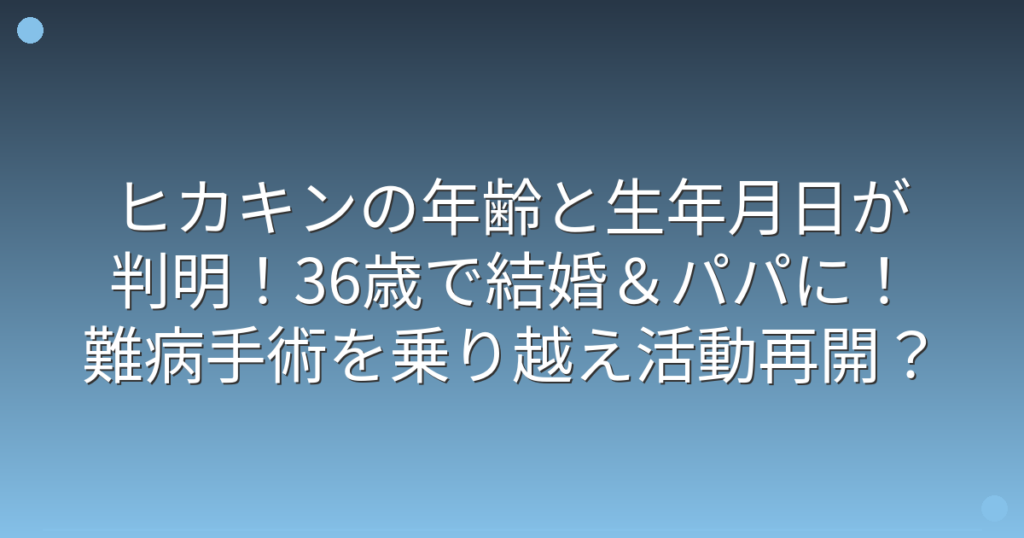 人気YouTuberのヒカキンさんが、2024年に結婚・出産を経験し、2025年には難病手術を乗り越えて活動を再開したことが大きな話題となっています。 ヒカキンさんの年齢や最近の出来事について、多くの方が気になっているようですね。 そこで今回は、ヒカキン... -