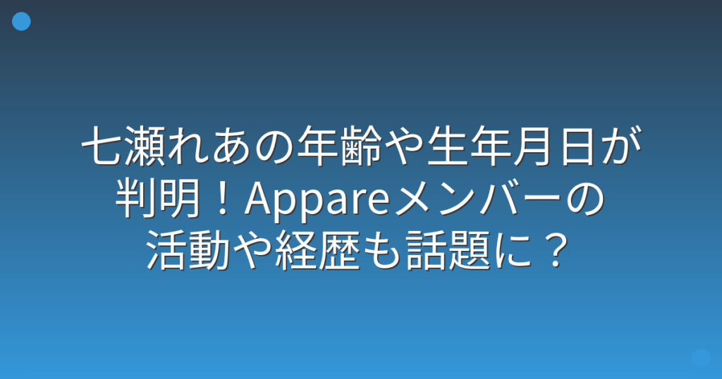 人気アイドルグループ「Appare」のメンバーとして活躍している七瀬れあさんについて、最近注目が集まっていますね。 特に七瀬れあさんの年齢や生年月日について、ファンの間で関心が高まっています。 そこで今回は、七瀬れあさんの年齢や生年月日、そしてA...