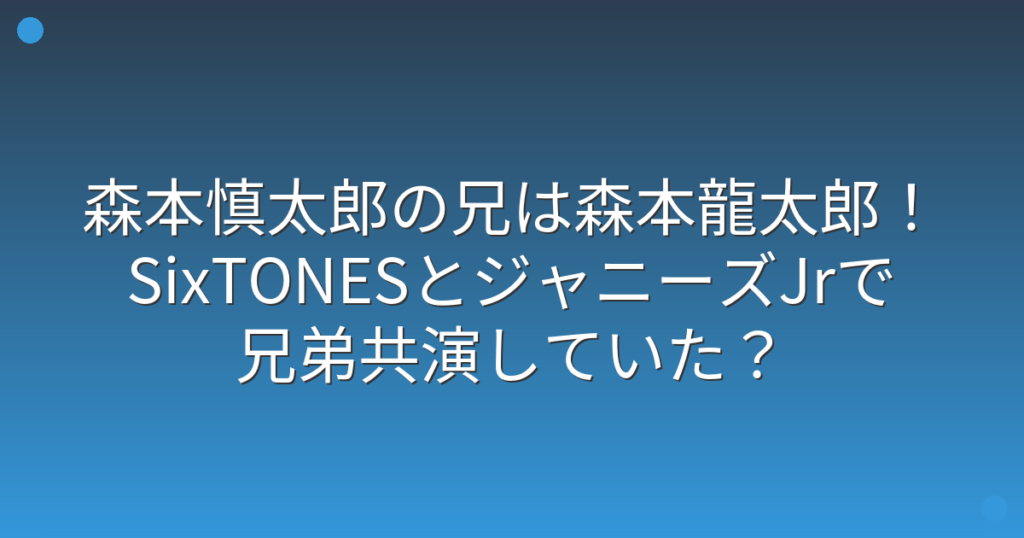 SixTONESのメンバーとして活躍する森本慎太郎さんですが、実は兄もジャニーズ事務所に所属していたことが話題になっていますね。 兄弟揃ってジャニーズというのは珍しいケースですが、2人の関係性やエピソードについて気になる方も多いのではないでしょう...