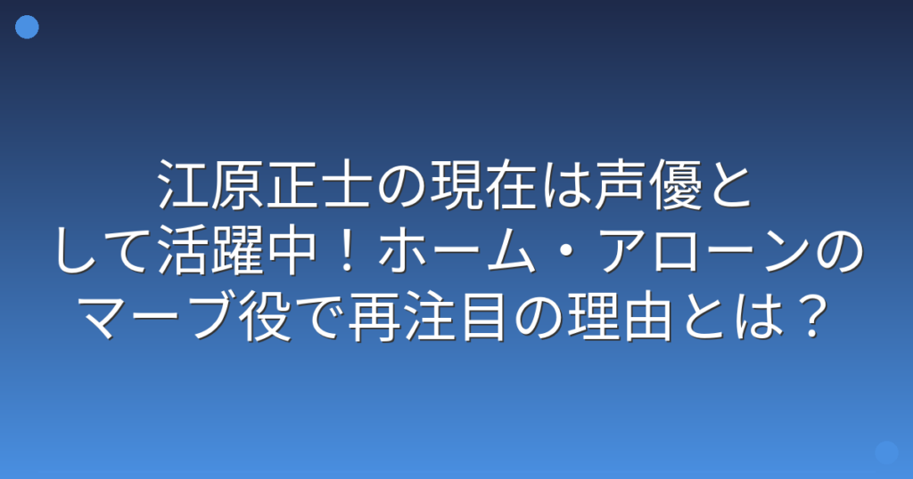 ベテラン声優の江原正士さんが、2025年現在も声優として精力的に活動されていることが話題になっていますね。 特に映画「ホーム・アローン」シリーズの吹き替えでマーブ役を務めていることで知られており、クリスマスシーズンになると毎年注目を集めていま...