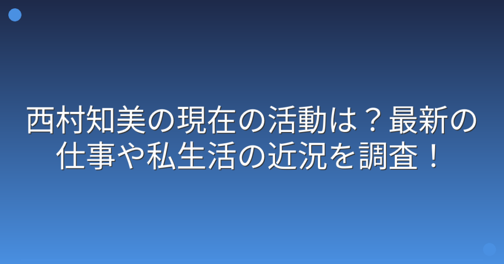 80年代アイドルとして一世を風靡した西村知美さんが、最近どのような活動をしているのか気になっている方も多いのではないでしょうか。 デビュー当時の可愛らしい姿から時を経て、現在の西村知美さんはどのような生活を送っているのでしょうか。 そこで今... -